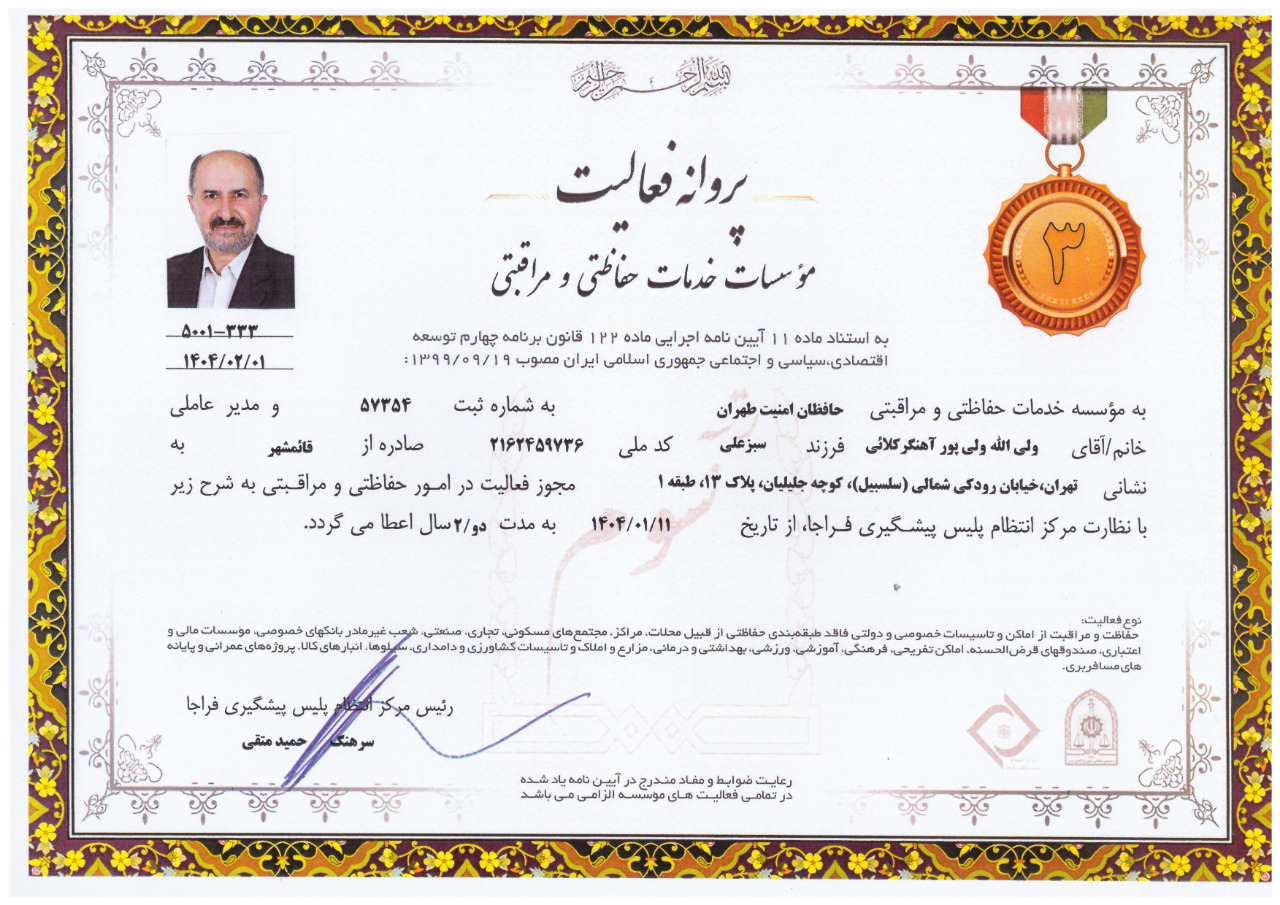 مجوز ما از مرکز انتظام پلیس پیشگیری فراجا صادر شده است و با مجوز رسمی زیر نظر مرکز انتظام فعالیت داریم.